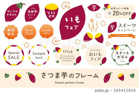 さつまいもと焼き芋のイラストとフレームセット。タイトル見出し、ラベル素材、シンプルなベクター飾り。
