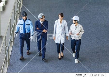 会議する様々な職業の人々(ビジネスマン・エンジニア・研究者・警備員)