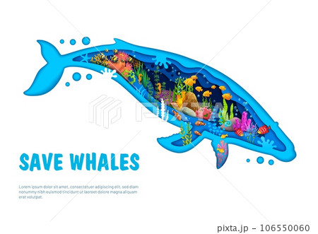Save sea whales banner, paper cut whale silhouette with underwater landscape, vector eco poster. Undersea environment and sealife ecosystem protection poster to save sea whales in papercut layers