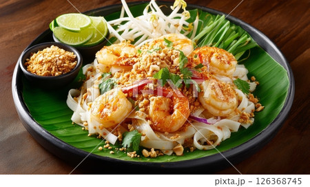 Delicious pad thai with shrimp and peanuts on banana leaf.