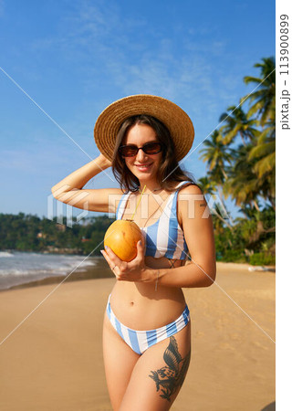 Woman in bikini holds fresh coconut on sunny tropical beach. Fit physique, tattoo visible. Waves, palm trees, golden sand backdrop. Leisure, healthy lifestyle, summer vibes show vacation joy.