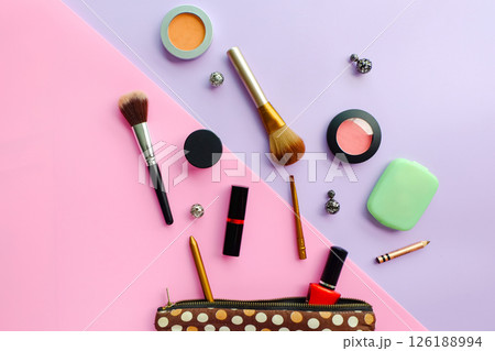 Bags and Accessories for women make up and jewelry fashion professional makeup accessories equipment attractive fashion lady on colorful background .Beauty concept