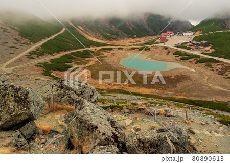 岐阜県高山市の乗鞍岳(畳平)の鶴ヶ池付近から西側のバスターミナルと恵比寿岳方面を見る