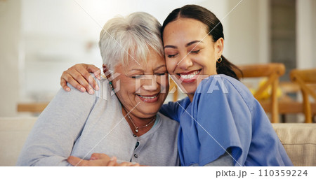 Happy woman, nurse and hug in elderly care for support, trust or love on living room sofa at old age home. Face of female person, doctor or medical caregiver hugging senior patient in relax at house
