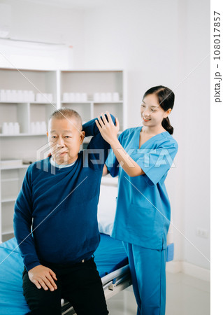 Physical therapist caregiver Asian and Caucasian senior women trust moving hand in rehabilitation. Physiotherapy healthcare, Medical caregiver consulting disabled elderly patient at home