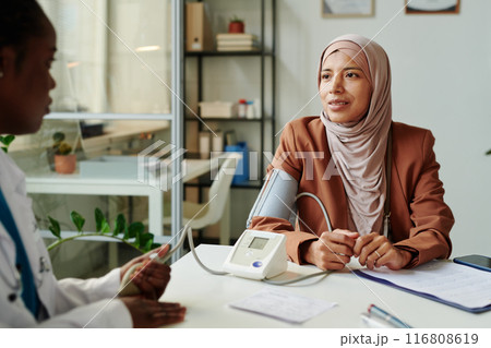 Portrait of Concerned Muslim Woman Wearing Hijab in Office Setting