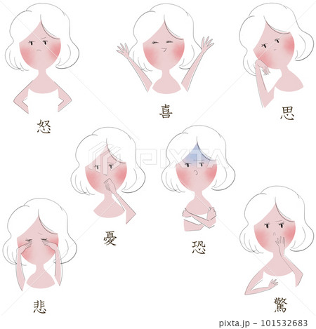 東洋医学の病気の原因である怒、喜、思、憂、恐、悲、驚の七つの感情(七情)を若い女性で表したイラスト