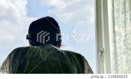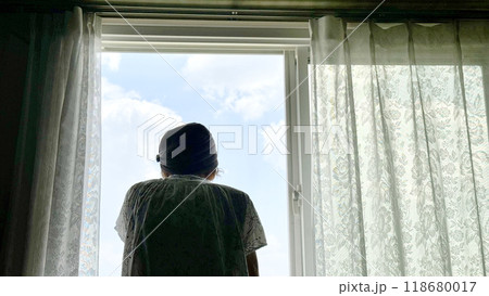 レースのカーテンがかかった窓から青空を眺める女性の後姿