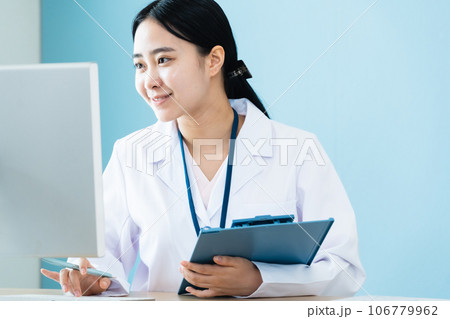 パソコン作業をする白衣姿の女性