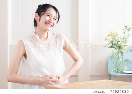 ベッドルームにいるミドル世代の女性(笑顔)