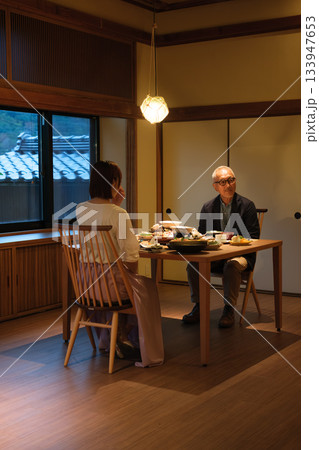 旅館の親子2人でゆったりと楽しむ夕食シーン