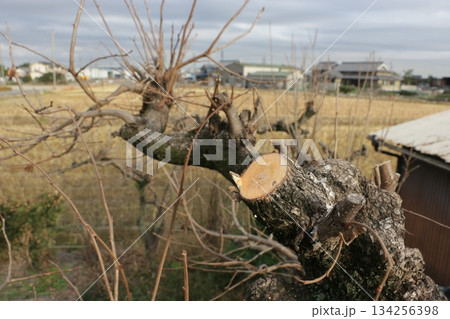 太い枝を剪定した後の桜の木