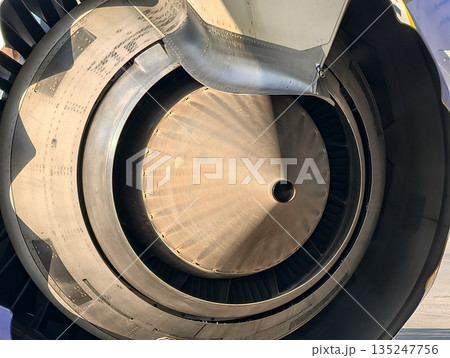 closeup of turbine blades and maintenance, industrial jet engine components under hangar lighting