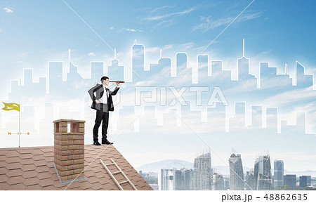 Engineer man standing on roof and looking in spyglass. Mixed med