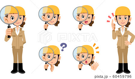 虫眼鏡で調査するヘルメットを被った工事現場の女性の全身と表情のセット ベージュの作業着