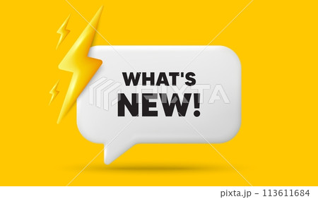 Whats new tag. 3d speech bubble banner with power energy. Special offer sign. New arrivals symbol. Whats new chat speech message. 3d offer talk box. Vector