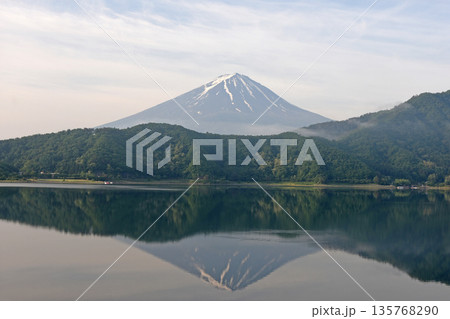 初夏の静かな奥河口湖の湖面に映る深緑の足和田山と群青色の山肌にくっきりと残る残雪の白い筋の逆さ富士