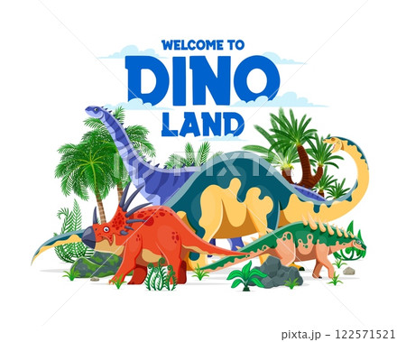 Prehistoric dinosaurs world banner. Prehistoric animals, paleontology museum exhibition cartoon vector poster with hypselosaurus, styracosaurus and polacanthus, melanorosaurus dinosaurs characters