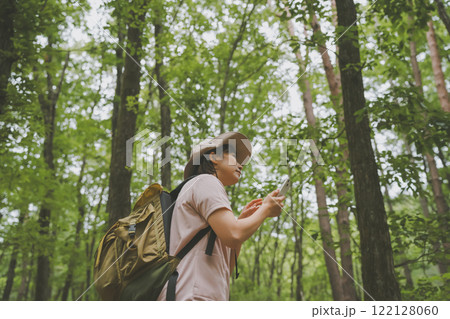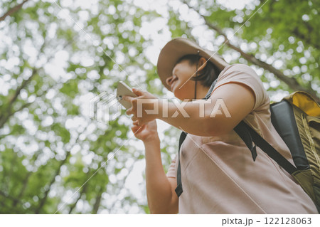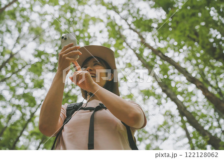 スマホで撮影する登山服を着たシニア女性の全身写真