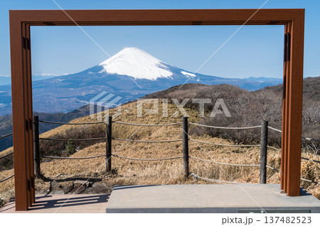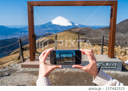 スマートフォンの画面越しに映る冬の富士山と箱根の景色