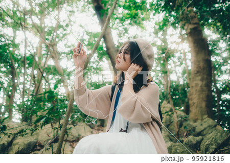 自然の中で音楽を聴く女性の写真
