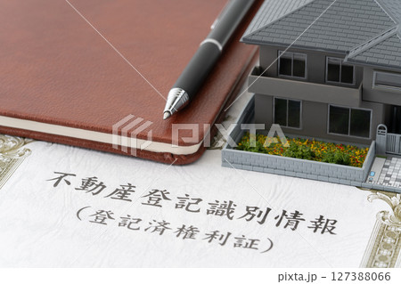 ミニチュアの一戸建て住宅と不動産登記識別情報(登記済権利証)