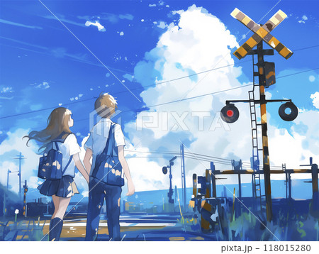 踏切前 男女の登下校の様子 水彩画