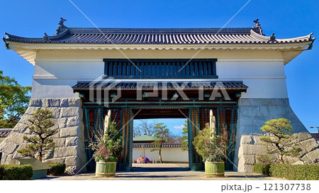 青空とお正月飾り(門松)に彩られた岡崎城大手門〈岡崎城公園/愛知県岡崎市〉