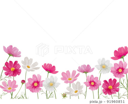 ピンクと白のコスモスの花畑 コーナーフレーム 秋の草花の水彩画