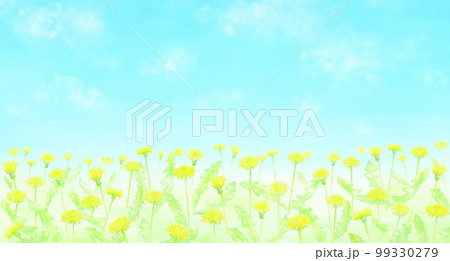 青空の下に広がるタンポポ畑の水彩イラスト。