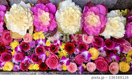 1月の花手水(葉牡丹・薔薇・デンファレ・菊)〈菅生神社/愛知県岡崎市〉