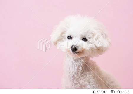 ピンクバックで微笑むトイプードルのアロンちゃん