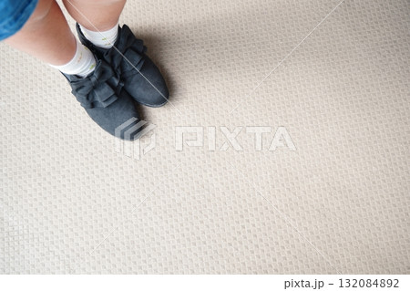 黒いリボン付きシューズを履いた子どもの足元の写真