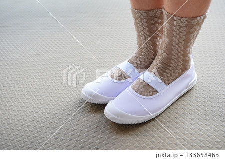 白く清潔感のある新しい上履きと、模様入りの靴下を履いた足元を撮影。