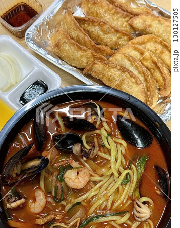 A steaming bowl of jjampong, the spicy Korean-Chinese noodle soup loaded with seafood, vegetables, and rich, flavorful broth. A hearty and satisfying comfort dish.