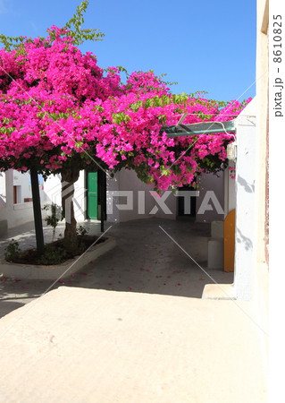 Charming typical floral streets of greek islands. Mykonos, Cyclades.