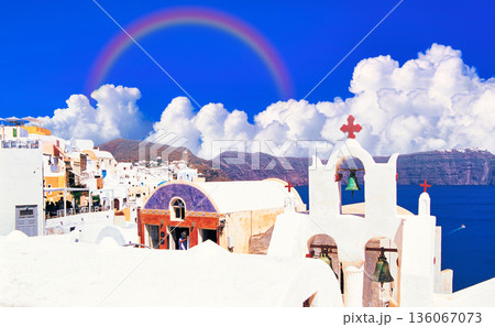 断崖絶壁に立つサントリー島の白い街並み夕景