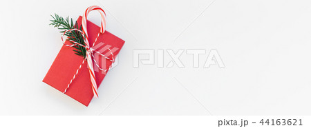 Christmas, New year frame composition. Gift box, red decoration, candy canes and confetti on white