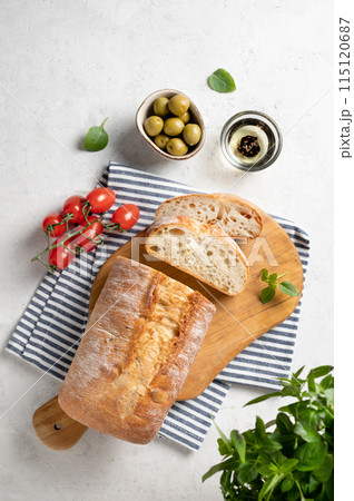 Fresh italian ciabatta bread cut slices with tomato, basil and olive on white background. Top view