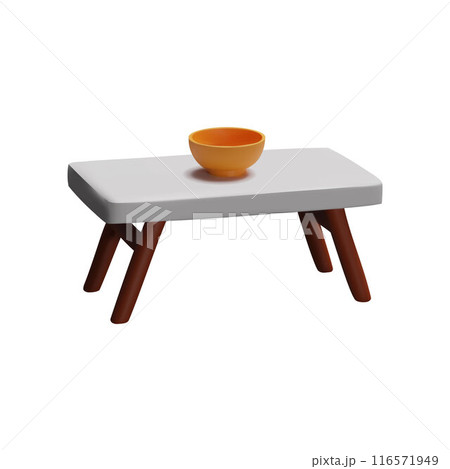 Wooden or plastic table with white countertop and orange bowl 3D plastic style vector icon, dining furniture