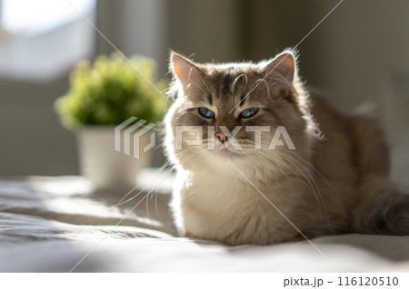Portrait of comfortable white furry Persian cat lying down on sofa.