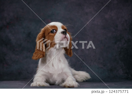 Beautiful Cavalier King Charles Spaniel puppy on a gray background. Studio shooting