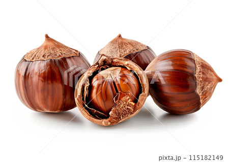Close-up of shelled and unshelled Chestnut nuts isolated on a white background, showcasing their texture