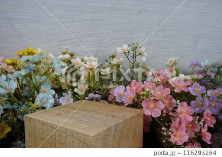 Wooden podium display scene stage showcase front view with copy space and flowers decoration