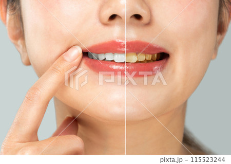 女性は白い歯を指差している。