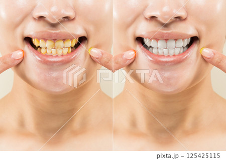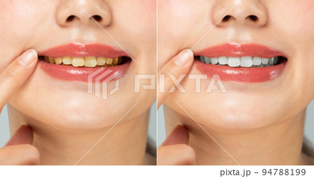 " ホワイトニングの効果 " 黄ばんだ歯と白い歯のクローズアップ相対比較.