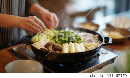 Traditional Asian hot pot with fresh vegetables and mushrooms simmering in broth