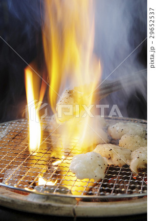 滴る油で炎を上げながら焼く、炭火焼きのホルモン