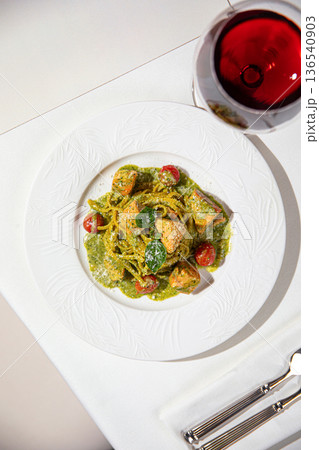 Green pesto pasta with salmon and red wine