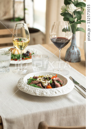赤ワインと楽しむ本格的な肉料理のメインディッシュ 高級レストランのペアリングコースのイメージ
